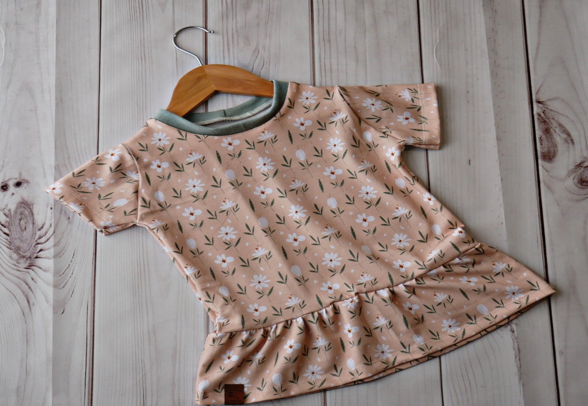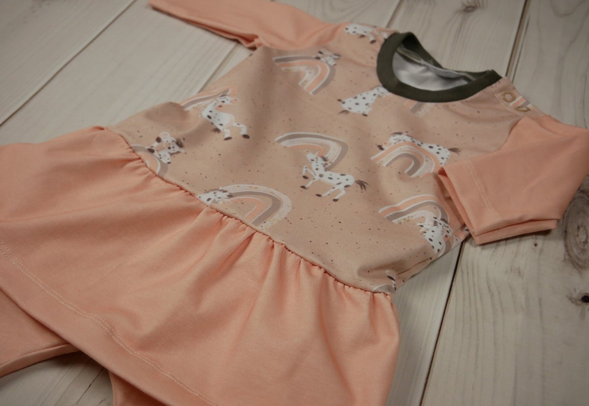 Für die Mädels kann das Shirt auch gerne mit einem Volant genäht werden, was somit einem Kleid ähnelt.